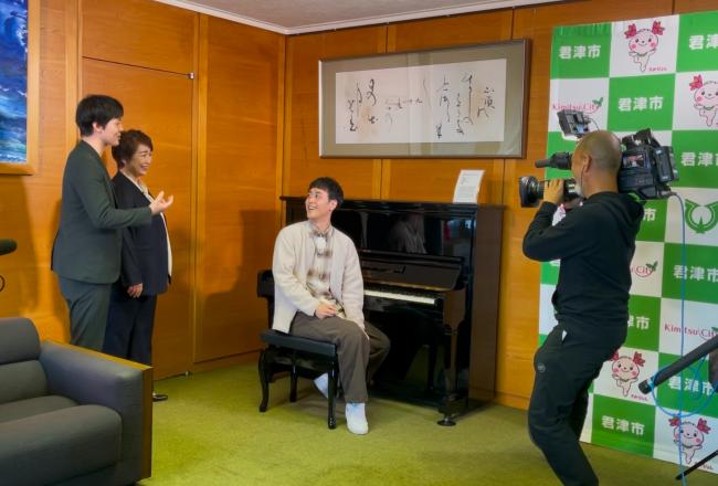 その街の人やグルメ・景色・体験などを満喫するチバテレの「市町村てくてく散歩<外部リンク>」で、人気お笑い芸人「ラパルフェ」の都留さんと尾身さんをゲストにお迎えし、君津が誇る魅力のひとつとして松本ピアノをプロモーションしました。