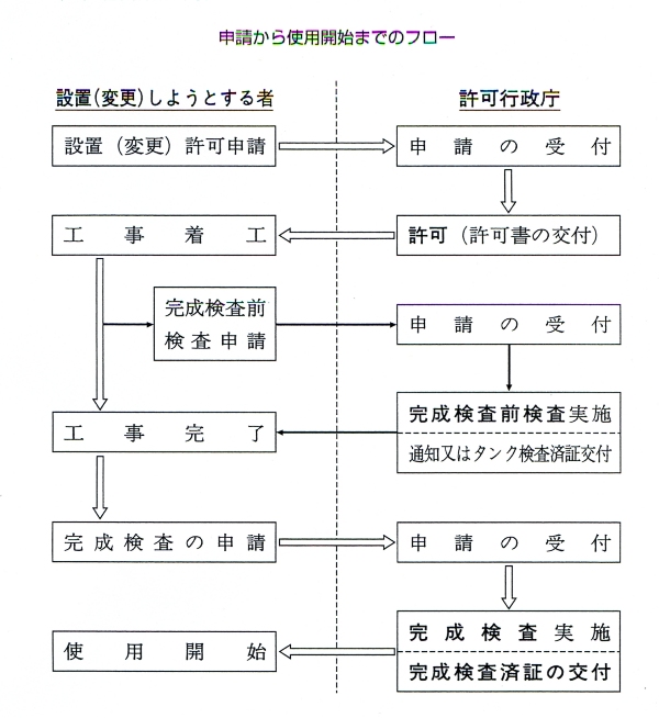 従って、製造所等を設置するためには、次のような手続きが必要で、製造所等の設置(変更)許可申請から使用開始までのフローはおおむね次のとおりです。